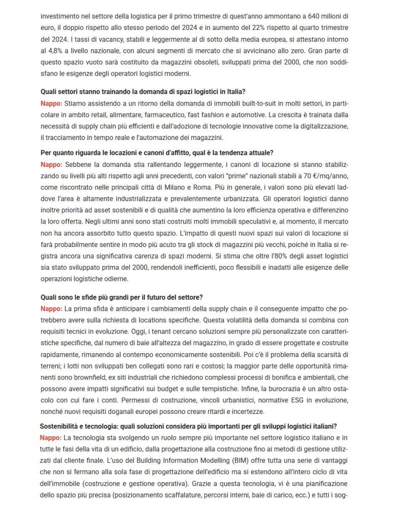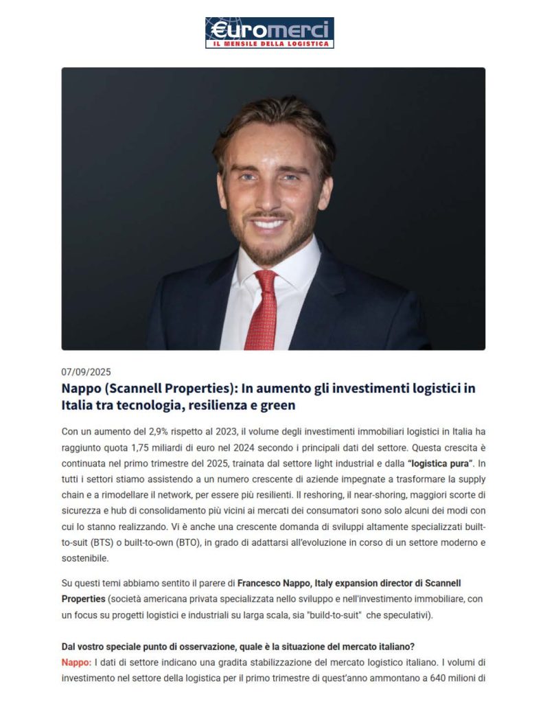09 Set NAPPO (SCANNELL PROPERTIES): IN AUMENTO GLI INVESTIMENTI LOGISTICI IN ITALIA TRA TECNOLOGIA, RESILIENZA E GREEN – EUROMERCI, 7 SETTEMBRE 2025 Posted at 12:21h in Rassegne stampa by Nicpr Share Stampa pagina