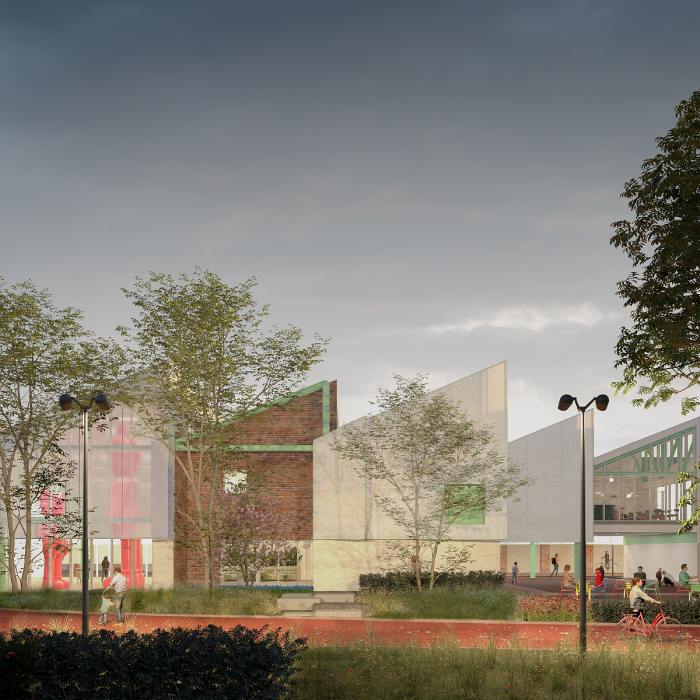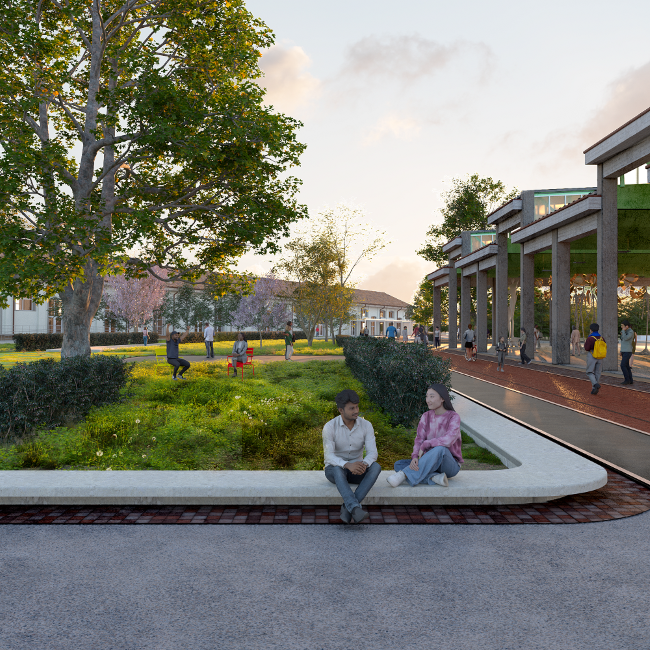Gli spazi esterni saranno articolati in una serie di ambienti tematici a forte valenza comunitaria, pensati per accogliere attività sociali, ricreative e culturali. L’Agorà, una grande radura verde che sostituisce l’attuale parcheggio, diventerà il cuore pulsante del distretto. Il Giardino Nascosto offrirà un’atmosfera intima e raccolta, mentre il Giardino nel Bosco fungerà da anticamera alla Foresta Urbana, segnando il passaggio dal costruito alla natura. La Piazza dello Sport rigenererà un’area critica con nuovi playground e zone ombreggiate, e la Foresta Urbana, realizzata tramite la piantumazione di alberi di medio-alto fusto, completerà il disegno verde rafforzando la connessione ecologica dell’intero intervento. Attraverso la realizzazione di una passerella ciclopedonale il parco sarà direttamente collegato ai Prati di Caprara formando appunto un continum verde.