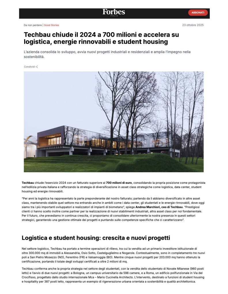23 Ott TECHBAU CHIUDE IL 2024 A 700 MILIONI E ACCELERA SU LOGISTICA, ENERGIE RINNOVABILI E STUDENT HOUSING – FORBES, 23 OTTOBRE 2025 Posted at 13:04h in Rassegne stampa by Nicpr Share Stampa pagina