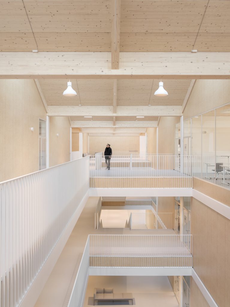Il progetto ha affrontato inoltre con rigore i temi dell’accessibilità e dell’inclusione: tutti gli ambienti – dalle aule scolastiche agli spazi pubblici, fino ai due piani interrati per gran parte destinati ad autorimessa – sono pienamente accessibili ai portatori di handicap, con percorsi privi di barriere, ascensori e servizi dedicati. Anche gli spazi esterni, progettati come una piazza urbana aperta in continuità su via Bassi, favoriscono la fruizione collettiva e la connessione con il tessuto cittadino.
